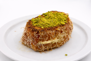 Kataifi coated french toast stuffed with ashta (drizzled with orange blossom syrup. Topped with pistachios.