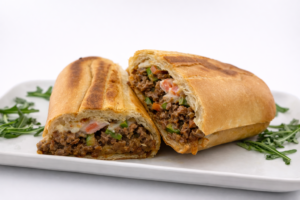 Soft Philly bread with ground beef, aleppo pepper, onion, jalapeno, american cheese, topped with tomato, harissa and garlic mayo.